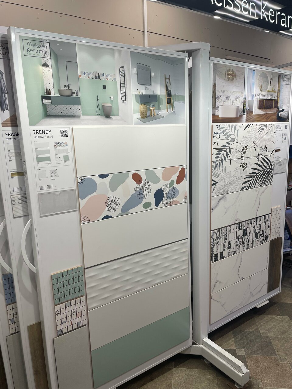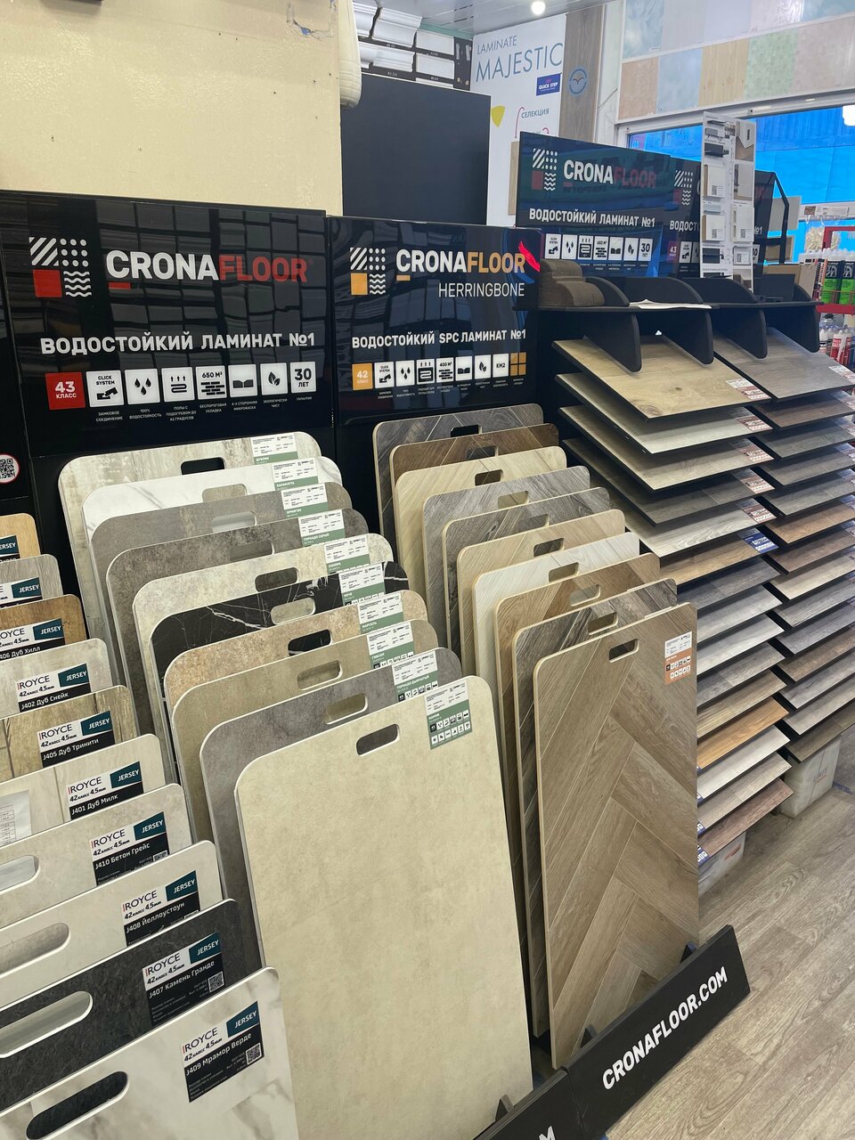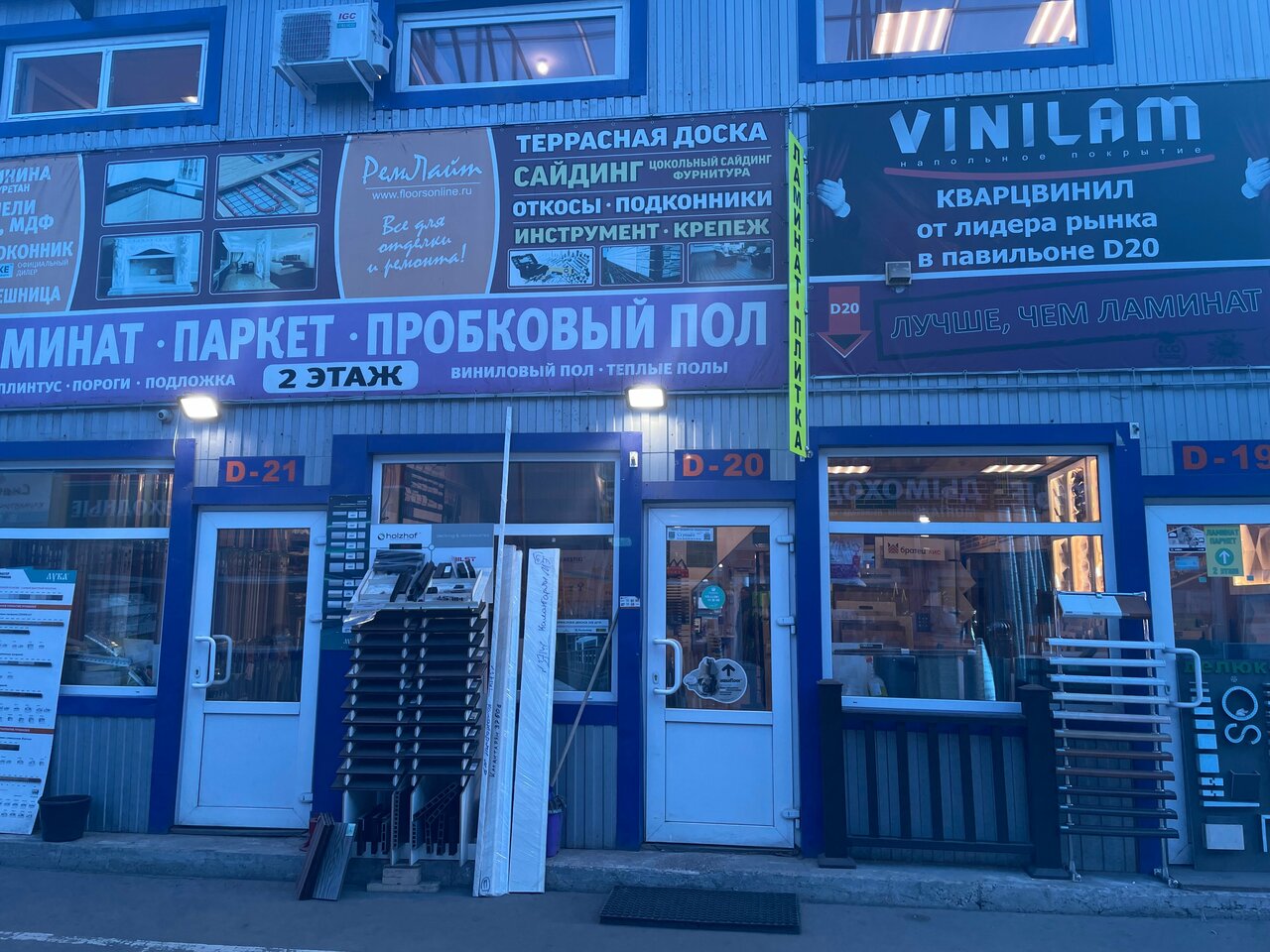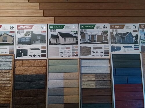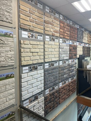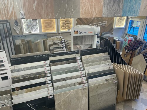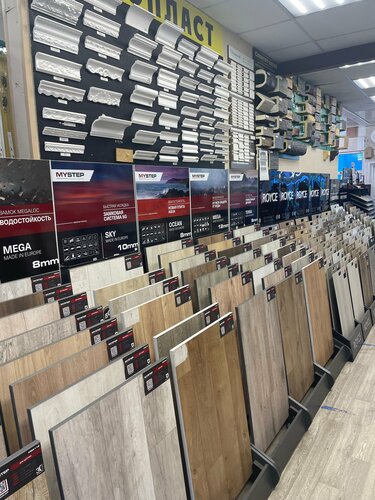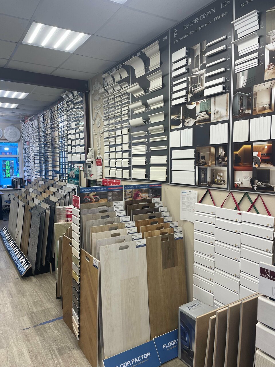 Огромное количество множество образцов материалов: ламинат, паркетная доска, керамическая плитка и керамогранит, включая уличный утолщенный, террасная доска, всевозможная лепнина из полиуретана, дюрополимера и даже настоящего гипса.